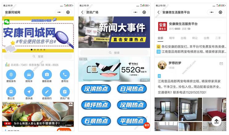 安康一站式便民信息服务平台,为安康人民提供最优质的便民服务。小程序功能包括:便民发布、顺风车、摄影拍客、查号台、公交查询、快递查询、疫苗预约以及同城资讯。安康市民可以在小程序中免费发布各类便民信息(如:招聘求职、同城问问、二手买卖、房源信息等等)