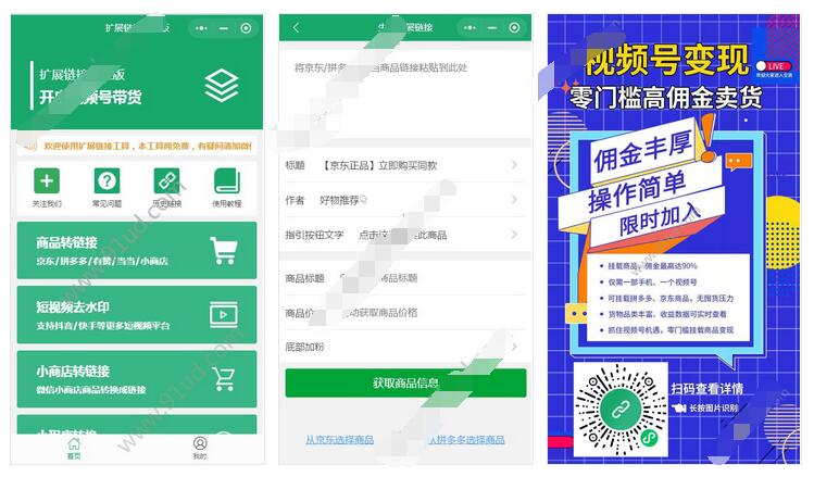 免费生成视频号扩展链接,免费零门槛挂载商品,视频号变现助手,开启变现新模式... 支持:京东、拼多多、当当、有赞、唯品会、小商店,自有小程序,加群/加好友等多种链接转换! 特点:免费、免费、免费!